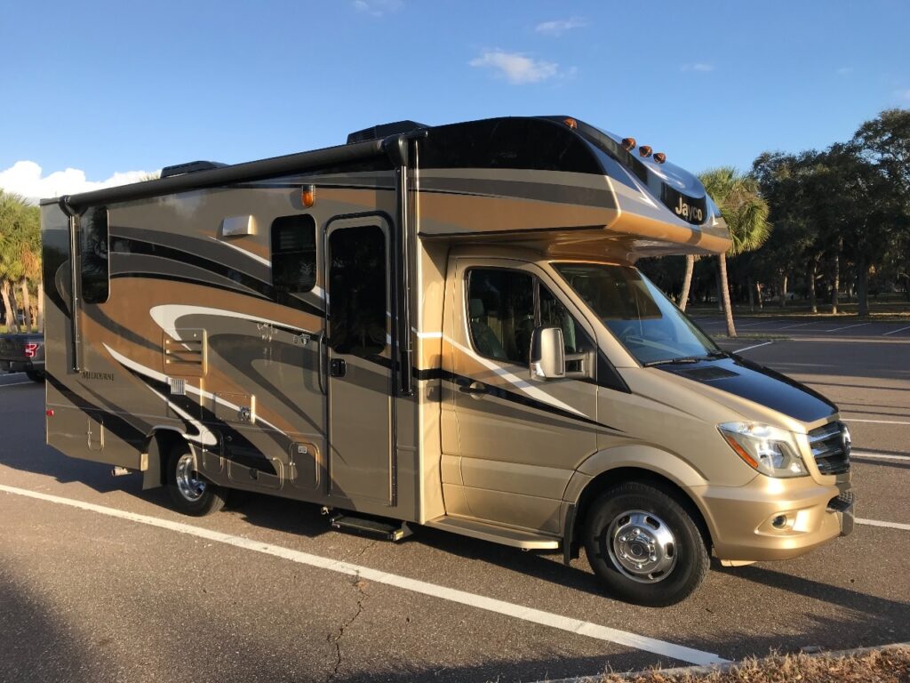 2018 Jayco Melbourne 24L Class C Motorhome is built on a 2017 Mercedes 3500 chassis and powered by a V6 turbo diesel 188hp engine.